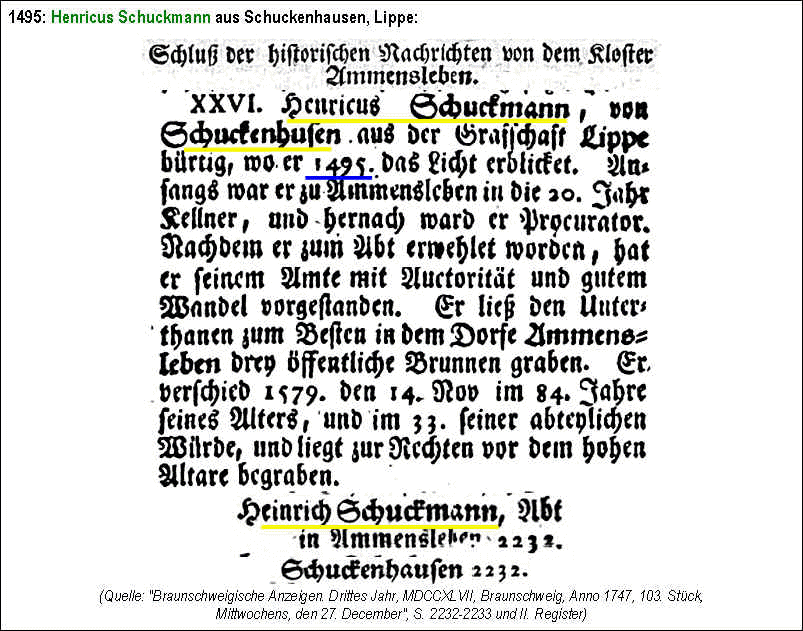 Genealogie von Jost Schuckmann vom Schuckenhof: (Siehe hierzu auch: die Genealogie der Schuckmann in Lemgo) 1589: Jost Schuckmann aus Schuckenhof: Schuckmann in Schuckenbaum: