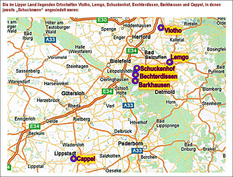 Weitere Schuckmann in der Lipper Gegend: Ab 1488: Namensaufkommen Schuckmann in Oerlinghausen (Schuckenhof), Lage, Wülfer, Leopoldshöhe, Bexterhagen: